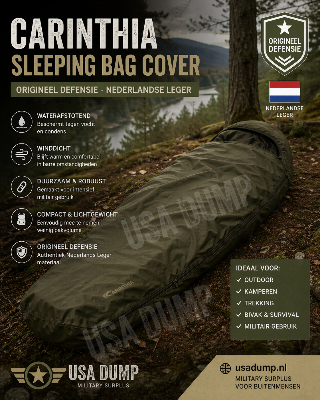 De Carinthia Gore-Tex Bivybag is een hoogwaardige bivakzak uit het leger. Deze waterdichte slaapzak cover met ademende Gore-Tex technologie biedt bescherming in alle weersomstandigheden. Ideaal voor bushcraft, hiking, outdoor en survival. Nu beschikbaar bij USADump.nl.